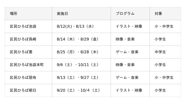 開催にあたり区の担当者は、「デジタル体験を通じて、自分のアイディアや自由な発想を形にし、多くの子どもたちが『楽しい!』『できた!』と前向きな気持ちになってくれると嬉しいです。プログラミングやデジタルツールが初めての子どもでも大丈夫です!本区で初めての事業ですが、東京都の皆さまと連携し、子どもたちの成功体験につながるよう、しっかりサポートしていきます」と話しました。「くりらぼin豊島」開催概要