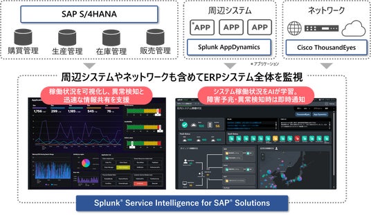 「Splunk」は、「SAP S/4HANA」のシステム全体を、周辺システムやネットワークも含めて、移行中も監視することで、業務全体を可視化し、障害の予兆検知や迅速な復旧を支援するものです。クラウドへの移行が複雑かつ長期となるERPシステムの稼働状況をAIが学習し、障害となる閾値を設定し、常時監視することで、オブザーバビリティ*1を実現します。ダッシュボードで、障害状況の詳細も把握でき、復旧時間の短縮と、業務全体の安定と効率化にも貢献します。