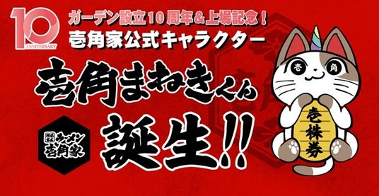 株式会社ガーデン(本社:東京都新宿区 代表取締役社長:川島賢 以下「当社」)が運営する「壱角家」は、ガーデン設立10周年と、昨年東京証券取引所スタンダード市場への上場を記念して、壱角家の公式キャラクター「壱角まねきくん」が誕生したことをお知らせします。壱角家から発信されるさまざまな情報や、店舗に登場しますので、乞うご期待ください。