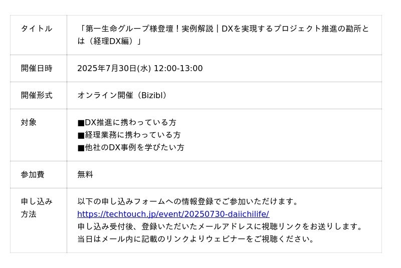お申し込みはこちら:https://techtouch.jp/event/20250730-daiichilife/