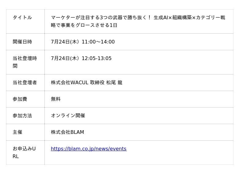 2025年7月24日開催のカンファレンス「マーケターが注目する3つの武器で勝ち抜く! 生成AI×組織構築×カテゴリー戦略で事業をグロースさせる1日」にWACULが登壇します。