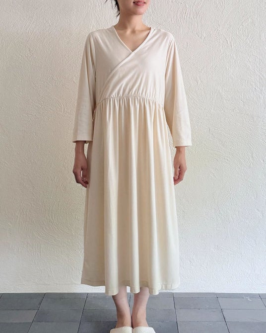 カシュクールデザインの胸元にスナップボタンを付け、授乳の際に付け外ししやすくしています。また、横になる時間も多いため、ゆとりあるデザインにしました。特にこだわったのは素材で、無染色のオーガニックコットン100%使用することはもちろん、肌に直接触れる内側にあえて生地の表目を使うことで、よりなめらかな着心地をお楽しみいただけます。また、産後は汗をかきやすいため、ガーゼ素材で深めの背当てを付けています。