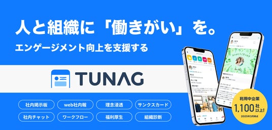 TUNAG(ツナグ)は、組織の生産性向上や離職率の低減を目的に、社内コミュニケーションと情報共有を促進し、従業員エンゲージメントを向上させるために開発されたプラットフォームサービスです。現在利用中企業は1,100社・利用ユーザー数は100万人を突破しています。