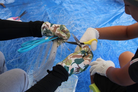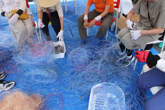 今回は三回目の開催ということもあり、開始前から本イベントを目的に来場していただいた方も多く、漁網に実際に触れながら分別作業を行いました。参加者からは「網に触れる機会なんてめったにないので面白かった」「新聞の告知を見て興味を持ちました」などの声が寄せられ、長時間にわたって作業に参加される方もいらっしゃいました。