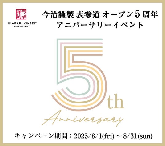スタイレム瀧定大阪株式会社(本社:大阪市浪速区 代表取締役社長:瀧 隆太)が運営する、手にする全ての人がタオルを通じてつながり「まいにち、もっと、しあわせ」になるタオルをお届けするタオルブランド「今治謹製(いまばりきんせい)」では、今治謹製 表参道オープン5周年を記念し、『オープン5周年アニバーサリーイベント』を、2025年8月1日(金)~8月31日(日)まで開催いたします。