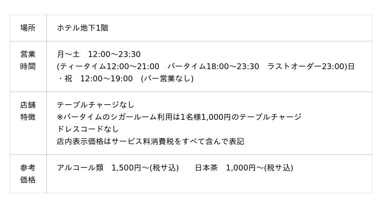 ジャパニーズウイスキーや国産クラフトジン、ビールなども国産銘柄を中心に多様な酒類を取り揃える他、日本茶や甘味にも注力しデイタイムより営業。シガールームも併設。