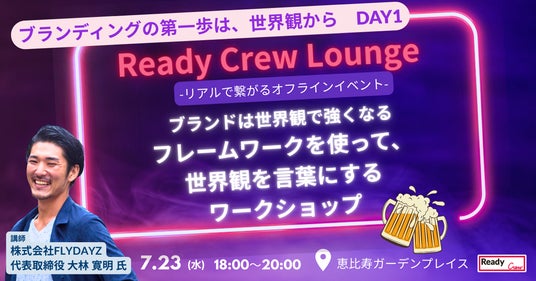 ビジネスマッチングコミュニティ「Ready Crew(レディクル)」を運営する、フロンティア株式会社(本社:東京都渋谷区、代表取締役社長:高橋 政裕)は、広報・マーケティング・企画・新規事業担当者を対象とした実践型イベント「『ブランディングの第一歩は、世界観から』DAY1 ブランドは世界観で強くなる~フレームワークを使って、世界観を言葉にするワークショップ~」を、2025年7月23日(水)に恵比寿の本社にて開催いたします。