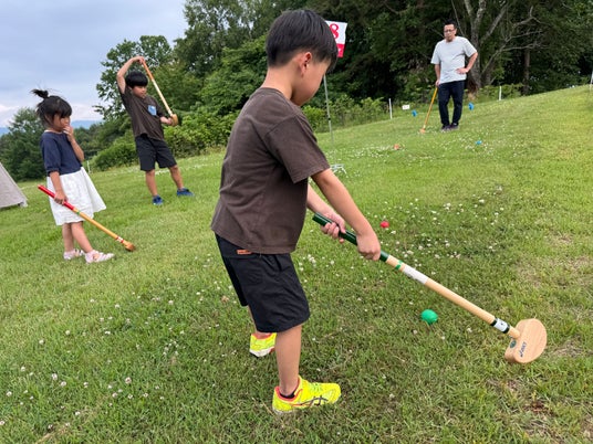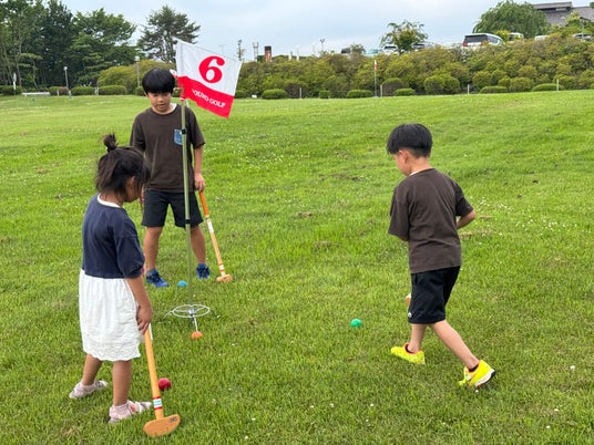 ◆グラウンドゴルフ:木製スティックを使ってピン(ゴール)を目指します。ご家族みんなでプレーできます。