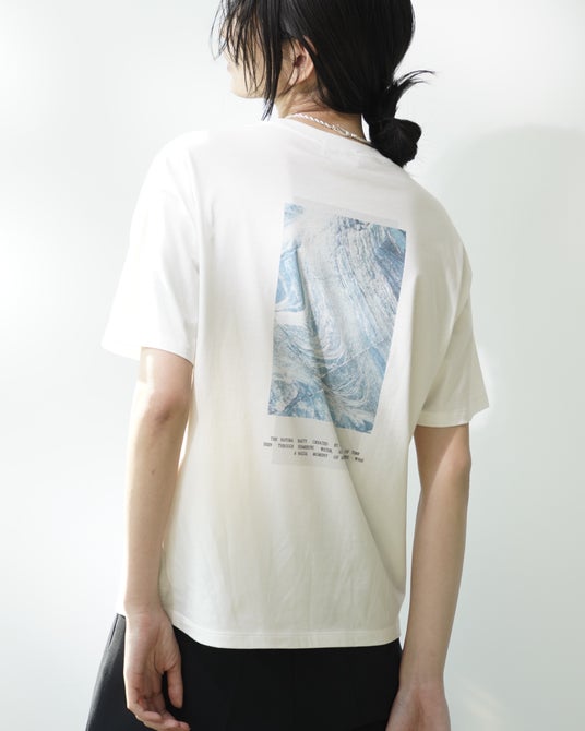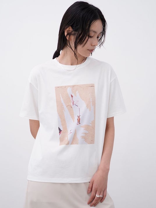 柔らかな視点が映えるフォトプリントは、ややゆったりとしたシルエットとも相性抜群。アートを纏うように日常に溶け込む一着です。
