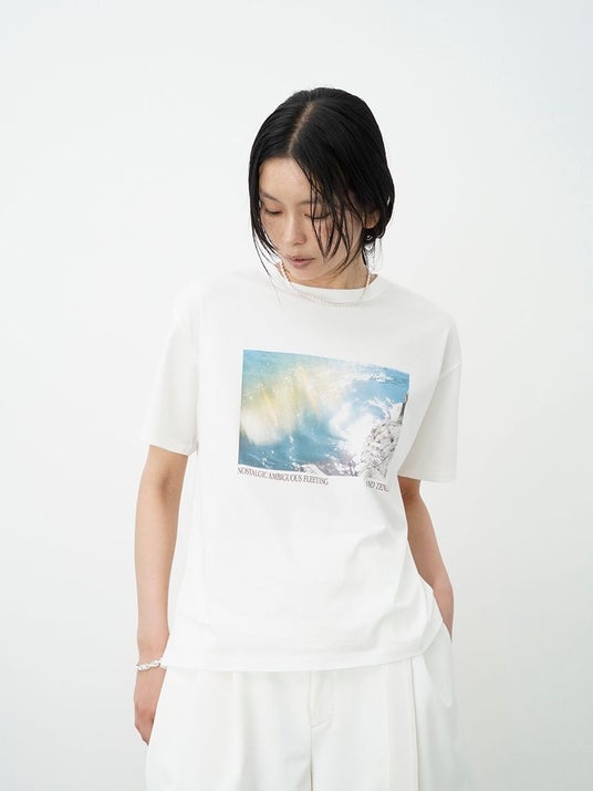 ホワイトの生地にその静寂と深みのある情景が美しく映える一着。日常に自然の詩情を添える、奥行きあるフォトTシャツです。