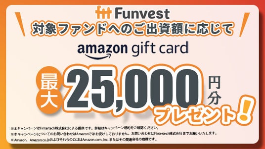 本ファンドへ出資していただいた投資家の皆様を対象として、出資額に応じて最大25,000円分のAmazonギフトカードをプレゼントするキャンペーンも併せて実施いたします。