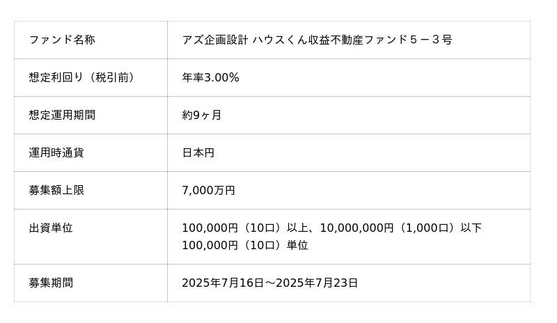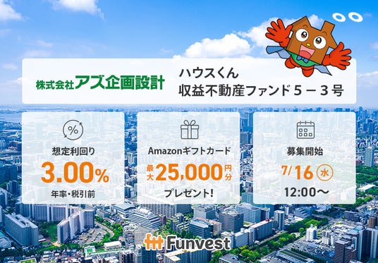 貸付型クラウドファンディング「Funvest」7/16より新ファンド「アズ企画設計 ハウスくん収益不動産ファンド5-3号」の募集開始