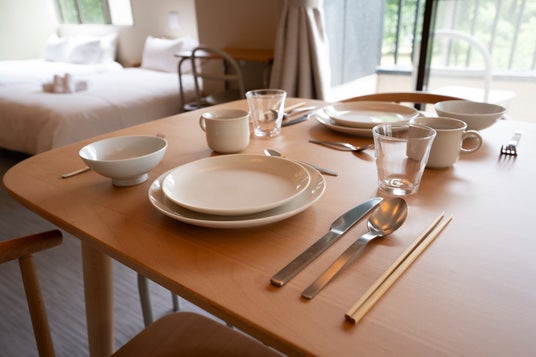 木の温もりが感じられるダイニングテーブルには、シンプルながら温かみのある器をセレクト。旅のひとときに、家のような食卓を。
