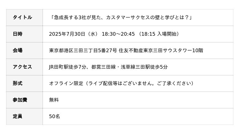 OneBox株式会社(本社:東京都渋谷区、代表取締役社長:伊藤直樹、以下「OneBox」)は、2025年7月30日(水)、「急成長する3社が見た、カスタマーサクセスの壁と学びとは?」と題したオフライン限定セミナーを東京都内で開催します。