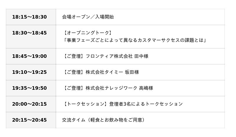 本セミナーは、フロンティア株式会社、株式会社タイミー、株式会社ナレッジワークという急成長中の企業3社をお招きし、普段聞くことのできないカスタマーサクセス(CS)の「ココだけの話」を共有いただく貴重な機会となっております。
