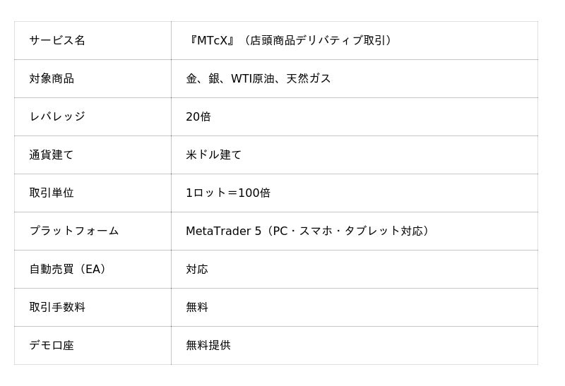 AIゴールド証券株式会社は、昨今の世界的なインフレ動向や地政学的リスクの高まりにより、金や原油など実物資産への関心が高まっている市場環境を背景に、個人投資家がグローバルな商品市場に手軽にアクセスできる環境を整備するべく、新たに店頭商品デリバティブ取引サービス「MTcX(エムティーシーエックス)」の取扱いを開始いたしました。このサービスを通じて、お客様には手数料無料・少額資金での取引・自動売買対応など、これまで専門的とされていた資源取引を、より身近に体験できるメリットを提供いたします。