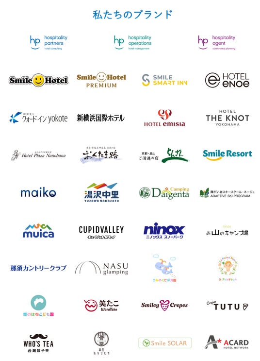 ホスピタリティパートナーズグループは、全国でホテル・旅館・グランピング・スキー場・ゴルフ場・飲食事業・保育園など多様な事業を展開し、それぞれの地域やお客様のニーズに寄り添ったブランドを育んでまいりました。このたび創業20周年を迎えるにあたり、私たちが大切にしてきたブランドの歩みと、そこに込めた想いをお伝えするため、当グループが展開するブランドのロゴを一覧でご紹介いたします。それぞれのロゴは、私たちの理念である「おもてなしで人々を笑顔にします」を体現し、サービスへのこだわりと地域に根ざした取り組みの象徴です。これからも各ブランドの個性を大切にし、ホスピタリティを通じてお客様に新たな感動と喜びをお届けしてまいります。