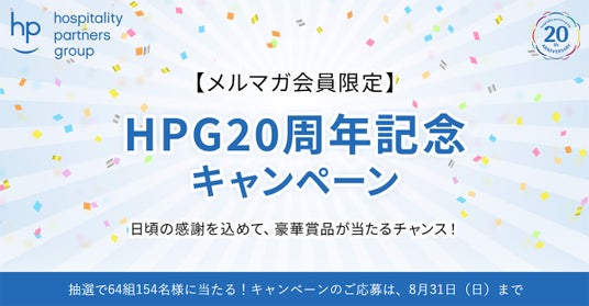 ホスピタリティパートナーズグループは創業20周年を記念し、2025年7月15日(火)より「HPG20周年記念キャンペーン」を実施いたします。全国のHPG施設でご利用いただけるご宿泊券やリゾート券、飲食券など、抽選で合計64組154名様に当たる豪華プレゼントをご用意いたしました。ぜひこの機会にご応募ください。