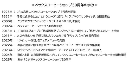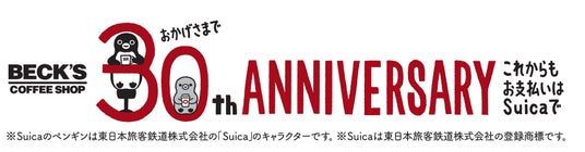 株式会社JR東日本クロスステーション フーズカンパニー(本社:東京都渋谷区、フーズカンパニー長:中俣博文)が運営するベックスコーヒーショップは、1995年に大宮駅に1号店を出店して以来、おかげさまで多くのお客さまに支えられ、2025年7月20日(日)に30周年を迎えます。ブランド誕生30周年を記念して、2025年をアニバーサリーイヤーとし、お客さまへ感謝を伝える各種キャンペーンを順次展開してまいります。第1弾として2025年7月20日(日)から、感謝の気持ちをこめた3つの特別企画をお届けします。また、その後もベックスコーヒーショップ30周年記念のSuicaのペンギンオリジナルグッズや、復刻フードメニュー、30周年記念ドリンクの発売など、これからの新たな旅立ちに向けてお客さまとの絆を深める企画を順次実施してまいりますので、ぜひお楽しみにお待ちください。