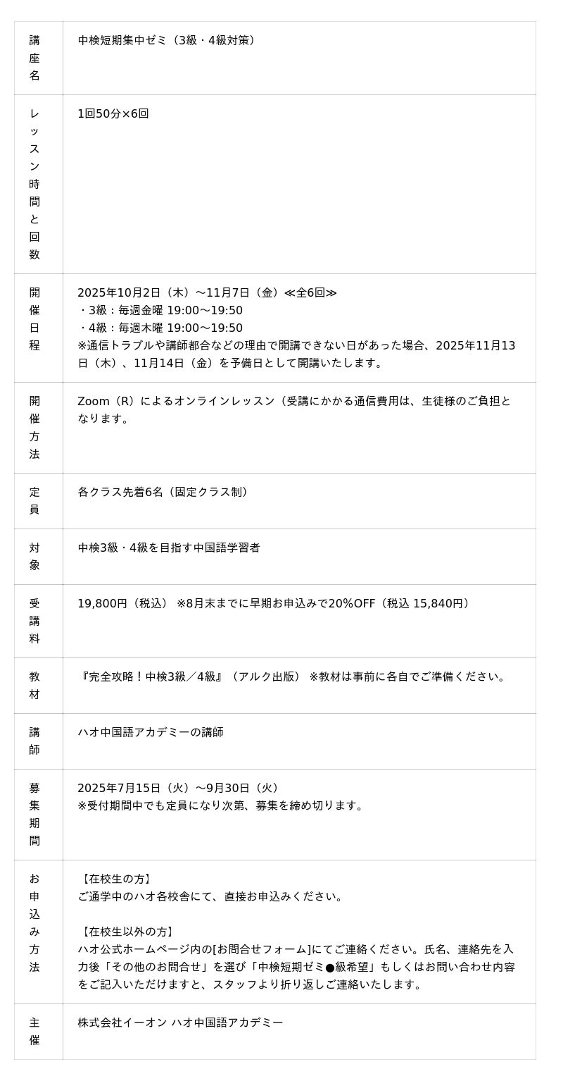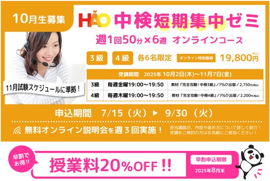 株式会社イーオン(本社:東京都新宿区、代表取締役社長:重野卓、以下「イーオン」)が運営するハオ中国語アカデミーは、2025年11月実施予定の「中国語検定(中検)」に向けた対策講座として、「中検短期集中ゼミ(3級・4級)」を10月よりオンラインにて開講いたします。