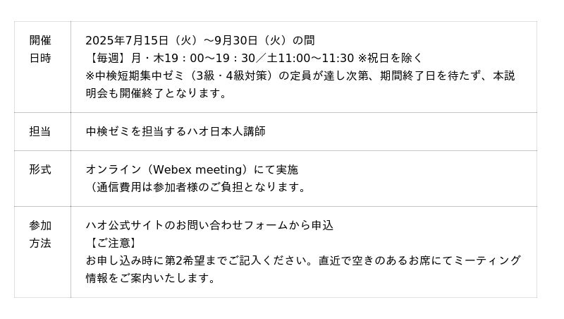 本講座は全6回の短期集中型プログラムで、忙しい社会人や学生の方でも無理なく継続できるよう、平日夜の時間帯に設定されています。全国どこからでもアクセス可能で、通学の負担なく効果的な学習が行えます。中検に精通した日本人講師が、主に筆記試験対策を中心に、市販教材を用いて中検合格に必要なポイントを解説します。