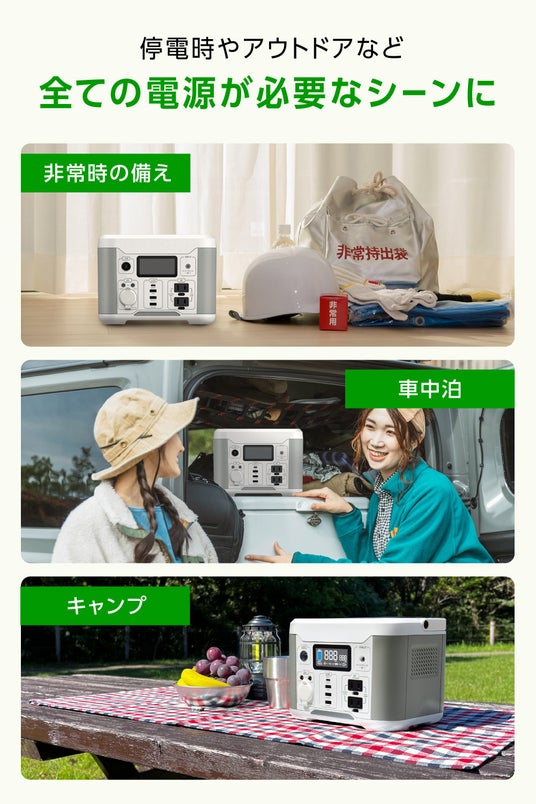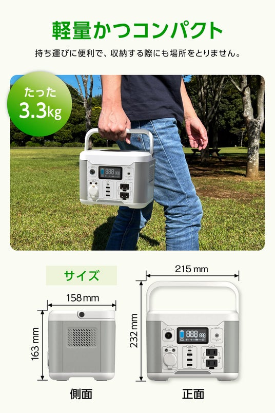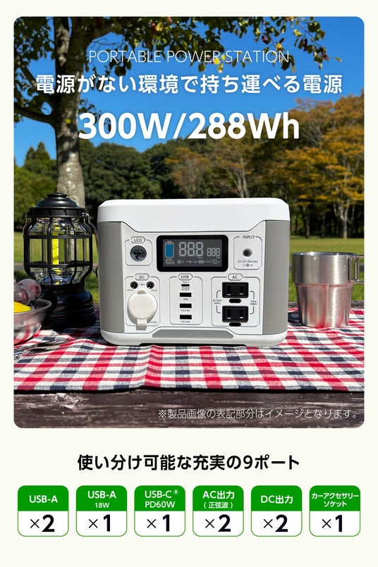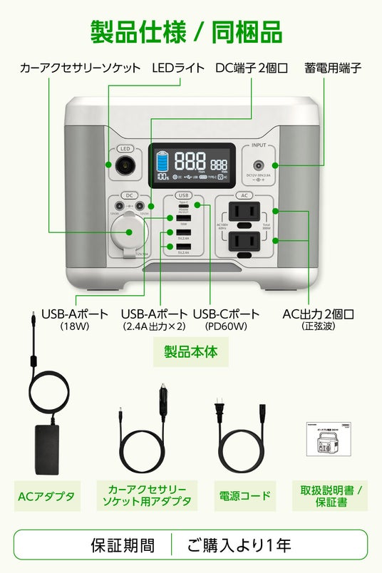 ・出力:AC出力(正弦波60Hz):AC100V x2個口(合計300W Max)、DC出力:カーアクセサリーソケットx1個口、DC端子 (DC12V/5A)x2個口、USB-A出力:5V/2.4A x2ポート、18W x1ポート(5V3A/ 9V2A/ 12V1.5A)、USB-C出力:1ポート(PD60W対応)