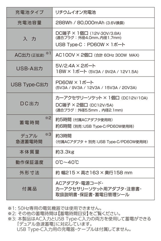 ・充電池タイプ:リチウムイオン充電池 (充電池容量:288Wh/80,000mAh 3.6V換算)