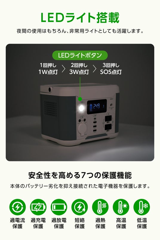 ・見やすい液晶ディスプレイを本体正面にレイアウト。入力・出力中の電力表示のほか、使用可能時間や満蓄電までの時間、電池残量、出力端子等を、わかりやすく表示します