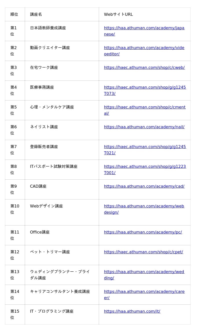 教育事業を展開するヒューマンアカデミー株式会社(本社:東京都新宿区、代表取締役:今堀健治、以下「当社」)の社会人教育事業「資格取得・就転職の総合校 ヒューマンアカデミー」は、社会人向けスクールで提供している全300以上の講座のラインナップから、2025年7月のおすすめ講座ランキングTOP15をまとめました。