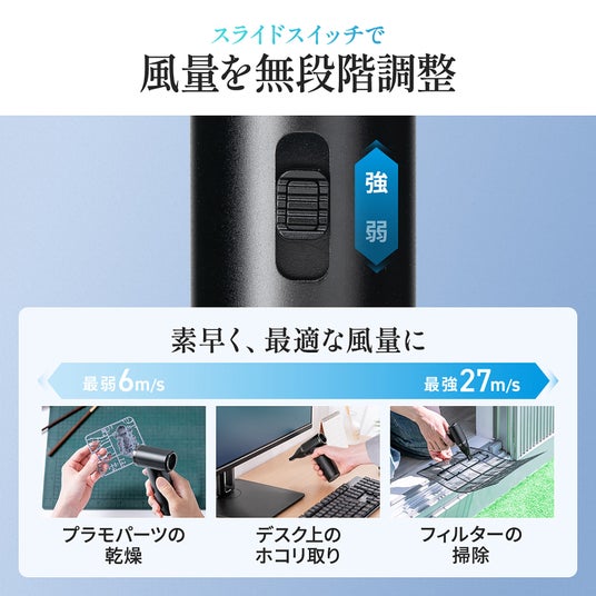 風速は6~27m/sの間を無段階で調整することが出来ます。スライドスイッチで調整するため操作がしやすくなっており、キーボードからエアコン、窓のサッシにサーキュレーターなど様々な場所で使用することが出来ます。また、本体は持ちやすいガンタイプのデザインになっています。
