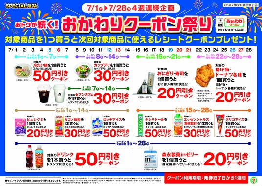 株式会社セブン‐イレブン・ジャパン(本社:東京都千代田区、代表取締役社長:阿久津 知洋)は、7月1日(火)から7月28日(月)までの4週連続で、対象商品を1つ購入すると次回使えるレシートクーポンをプレゼントする「おかわりクーポン祭り」を実施しております。