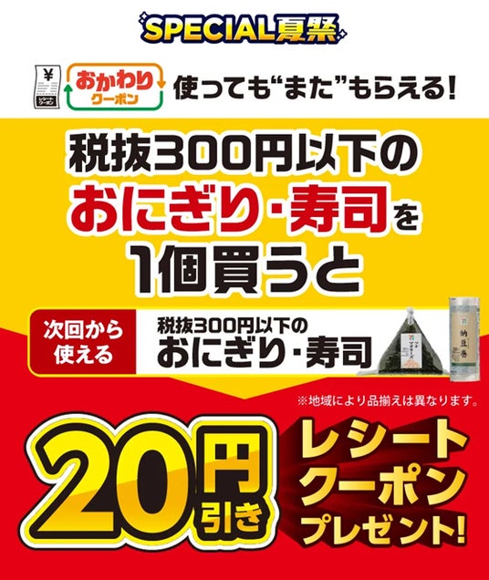 7月15日(火)よりセブン‐イレブンのおにぎり・寿司がお得に!夏のお得企画「おかわりクーポン祭り」開催 対象の「おにぎり・寿司」を1個ご購入ごとに次回使える20円引きクーポンをプレゼント!