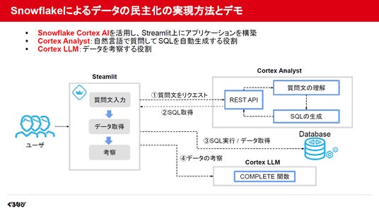 続いて登壇した技術戦略室の新井氏は、データの民主化の推進にあたって直面した課題として、「BIツールの学習コスト」「適切なデータアクセス管理」「料金コスト」の3点を挙げました。これらの解決策として、Snowflake上にStreamlitアプリケーションを構築。自然言語で誰もが簡単に必要なデータを取得できる仕組みを実現でき、ロールの設定によるデータの参照権限管理や、データの問い合わせ数に応じた料金コスト管理も可能になりました。
