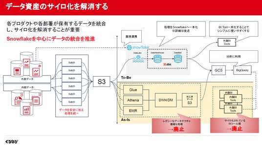 次に、岩本氏はデータの民主化に向けてぐるなびが抱えていた課題として、「データ資産のサイロ化」と「組織の縦割り構造」を挙げました。特に、組織構造の問題については、他部署のデータの使用にガバナンスが効いておらず、組織間でのデータ活用が不十分になってしまうという課題が発生していました。その解決策として、データへのアクセス管理に関するルールの全社的な見直しを実施。Snowflakeにデータ統合基盤を作ることで組織の壁を取り除き、ガバナンスが効いたデータの民主化を目指しました。