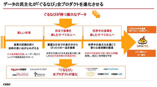 ぐるなびでは、「食でつなぐ。人を満たす。」をパーパスとしており、2745万人の会員と約42万店の掲載店舗数を有しています。外食産業と国内外の消費者をつなぐ「ぐるなびネットワーク」を構築し、国内外の消費者に豊かな食体験を提供しています。岩本氏は冒頭、全社員・全部署がデータを活用できる「データの民主化」の必要性に触れ、「データの民主化を実現することで、誰もが新しいビジネスを創出できるようになることが重要」と述べました。