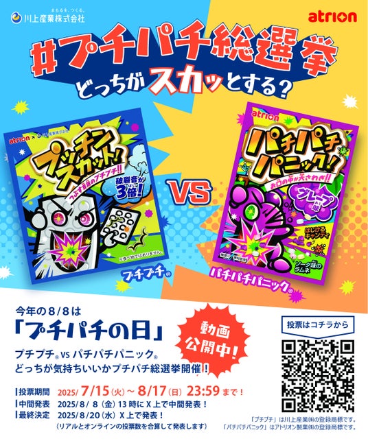 「プチプチ(R)」の製造販売を行う川上産業株式会社(東京都千代田区五番町6-2、代表取締役:安永圭佑)は、8月8日「プチプチの日」(日本記念日協会認定)に合わせて、今年は同日を「パチパチパニックの日」に制定しているアトリオン製菓株式会社(長野県須坂市高梨288、代表取締役社長:山下奉丈)とのコラボレーション企画【8月8日は「プチパチの日」!~“どっちが気持ちいい?”総選挙~】を展開いたします。本企画では、当社が製造・販売する“つぶす専用プチプチ”『プッチンスカット』と、アトリオン製菓の人気商品『パチパチパニック』が夢の異業種対決。「どっちが気持ちいい?」をテーマに、全国5,000名に体験していただくリアルイベントと、SNSで気軽に参加できるX(旧Twitter)投票キャンペーンの2本立てで実施します。