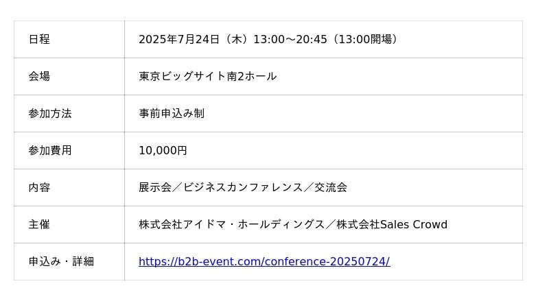 株式会社アイドマ・ホールディングス(本社:東京都品川区、代表取締役:三浦 陽平)と株式会社Sales Crowd(本社:東京都品川区、代表取締役:渡邊 芙美)は、2025年7月24日(木)に東京ビッグサイトで開催するビジネスカンファレンス「B2B CONFERENCE」の基調講演・パネルディスカッションの登壇内容を新たに公開しました。既に、2,100名を超える経営層の方に申込みいただいています。本カンファレンスは、AIを活用したビジネス変革と人材活用の最前線を体感できる機会として、多彩な講演と交流を通じて経営の未来を考える場を提供します。