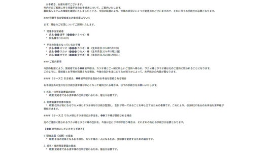 以下の文章は、最終的に基幹系システムのデータと手続きのナレッジ情報を元にAIが生成した来庁者向けのご案内文章です。「〇〇さんに必要な手続きは◇◇です」と明記されていることで必要な事務手続きが飛躍的に分かりやすくなります。AIからアウトプットを受けるまでの手順で操作者(住民)は一切プロンプト入力いたしません。