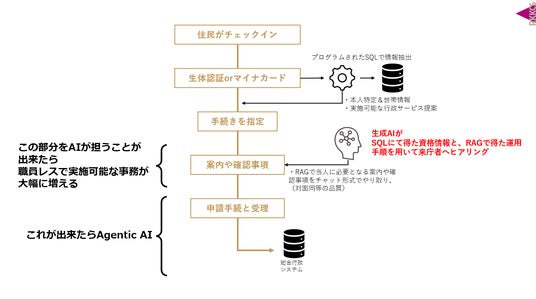 当社は今年4月に提供を開始した生成AI型マニュアルシステム「おとなりさん」や、今年1月に宇和島市でデジタル庁が主催したAIアイデアソンから生まれた「基幹系データベースと生成AIとの融合」をテーマとして制作したモックアップをご紹介しました。総合窓口の現場で職員レスを実現するために、業務担当職員によるご案内が必要な事務をAIが代替する流れを想定した試作品です。総合行政システム(基本データリスト)から、対象者の個人情報および資格情報を抽出し、その内容と予め学習させておいた法律や業務手続きに関する内容を組み合わせ、生成AIが窓口に来た住民に対して必要なご案内事項に対応するという仕組みになっています。今回はユースケースとして、「一部転居の事例に伴う児童手当の業務で、世帯が分離した場合の児童手当の手続きが複数想定されるパターン」を例に取り上げました。