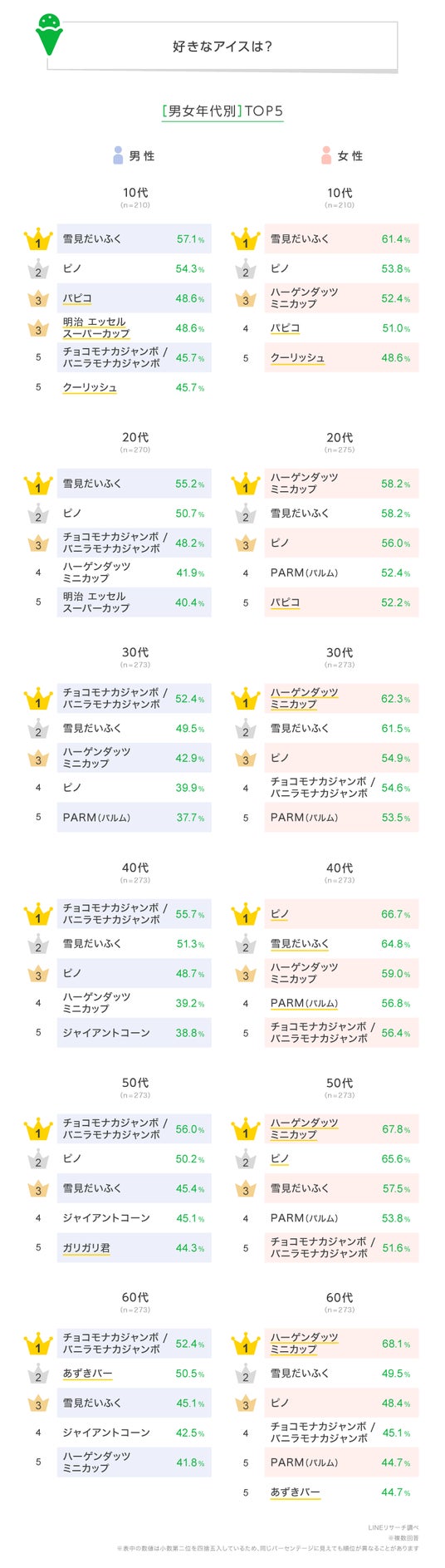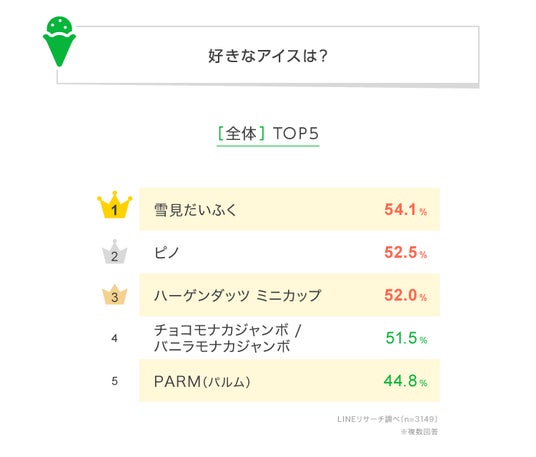 【LINEリサーチ】好きなアイスTOP3は「雪見だいふく」「ピノ」「ハーゲンダッツ ミニカップ」が5割強の僅差。男女では傾向が異なる結果に