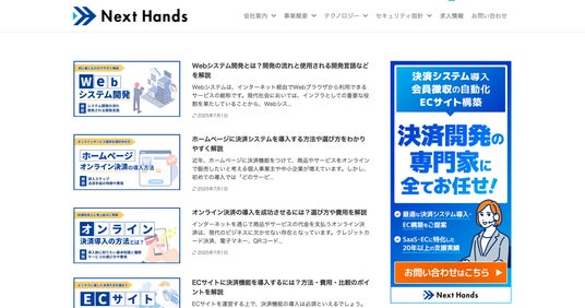 株式会社ネクストハンズ(所在地:静岡県駿東郡清水町、代表取締役:長田敏彦、以下「当社」)はこの度、決済システムやEC構築に関するお役立ち情報をまとめたコンテンツメディア「決済コラム(https://www.hands-inc.co.jp/column/)」を公開いたしましたので、お知らせいたします。