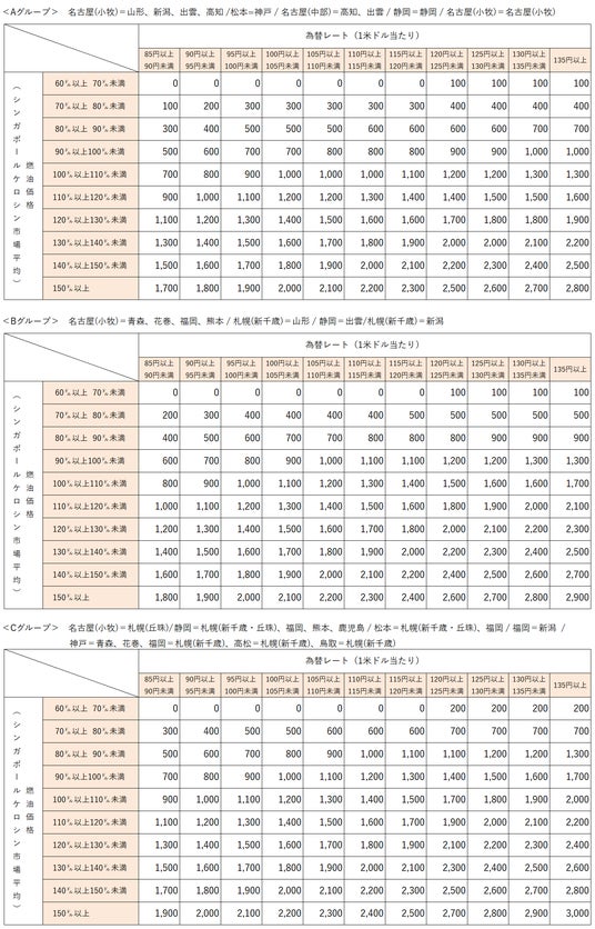 なお、燃油特別付加運賃は、シンガポールケロシン市況価格および為替レートの変動に応じて、 1ヶ月毎に見直しております。