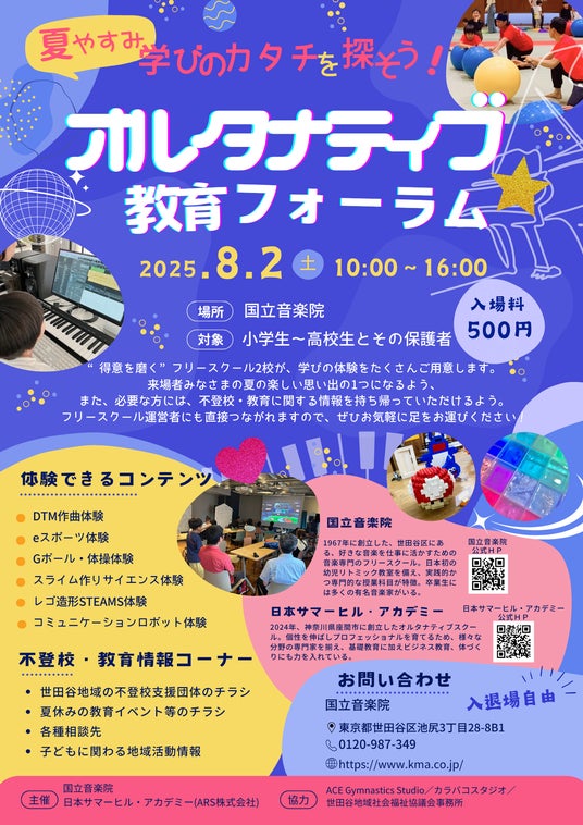 8月2日(土) 得意を磨くフリースクール国立音楽院&日本サマーヒル・アカデミー2校による「学びのカタチを探そう!オルタナティブ教育フォーラム」を開催