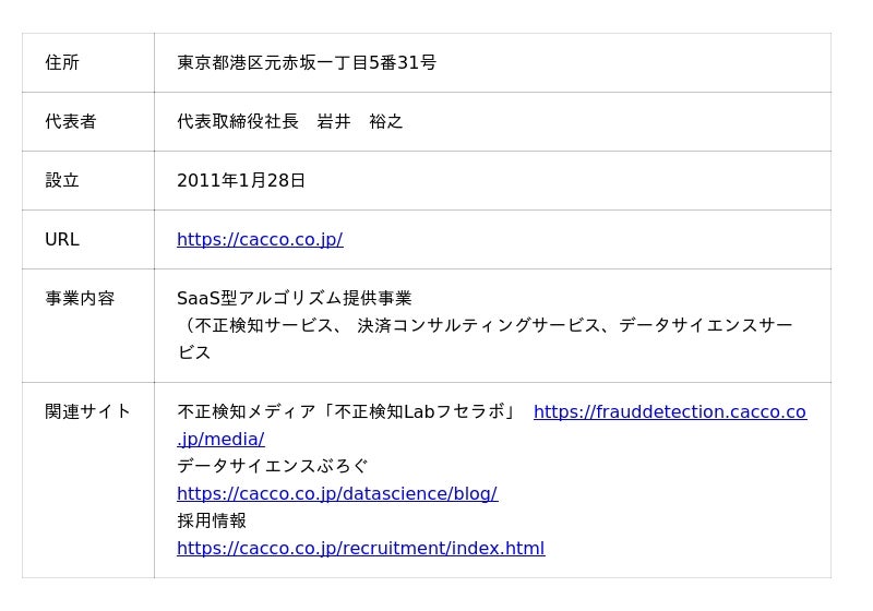 Caccoは、「未来のゲームチェンジャーの『まずやってみよう』をカタチに」という経営ビジョンを掲げ、セキュリティ・ペイメント・データサイエンス技術をもとに、アルゴリズム及びソフトウエアを開発・提供し企業の課題解決やチャレンジを支援することを目指しております。 オンライン取引における「不正検知サービス」を中核サービスとして位置づけ、不正ログインから不正注文対策まで対応可能な国内での導入実績数No.1の不正検知サービス「O-PLUX」や金融機関や会員サイトにおける情報漏洩対策の不正アクセス検知サービス「O-MOTION」、フィッシング対策サービス等を提供しております。