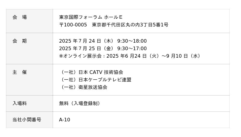 ※ 詳細はケーブル技術ショーの公式ウェブサイト(https://www.catv-f.com/)をご覧ください。