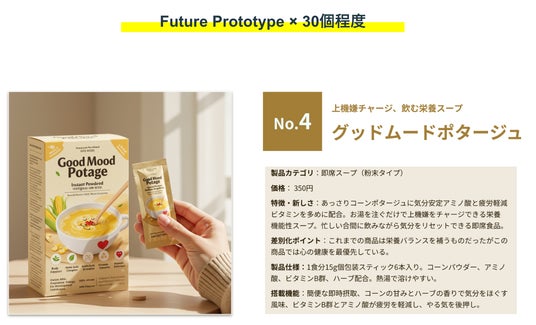 「NEXT 5-years DOOR」では、複数のLLM(ChatGPTやGeminiなど)を統合したSEEDER株式会社のAI技術基盤「Future Store」を活用しております 。Prompt Specialization(プロンプト特化処理)と非同期API処理により、複数のモデルから同時にインサイトを抽出し、セマンティックに正規化したうえで兆候を体系化。この情報をもとに、生成AIによるゼロショット推論を活用し、複数の視点からペルソナシナリオを生成。さらに、Insight GraphおよびGraph-based Reasoning(グラフに基づく推論)を用いて、潜在的ニーズや新たな市場領域を抽出します 。加えて、Promptプログラミングとマルチモーダル対応のLLMを活用し、具体的な未来の商品プロトタイプをアイデアカード形式で創出しています 。■NEXT 5-years DOORの納品物イメージ