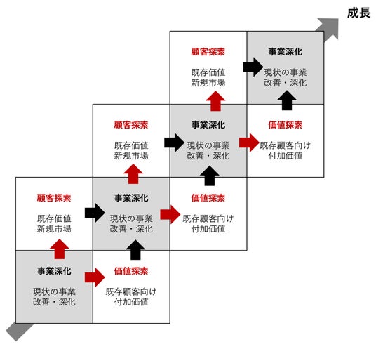 新規のニーズを掘り下げる「価値探索」と、新規の市場を開拓する「顧客探索」の2つを繰り返し、事業深化を続けていきます。