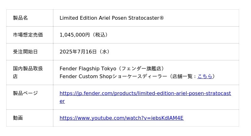 Fender Custom Shop 製品開発ディレクターのチェイス・ポールは、「アリエル・ポーゼンのプレイスタイルは、まさに息をのむほど圧巻です。美しいメロディ、緻密なテクニック、そして聴き手を引き込むダイナミクスを、幅広いギタリストが親しみやすく感じられる形で融合させる素晴らしい能力を持っています。Fender Custom Shopが彼のシグネイチャーモデルを製作するにあたり、私たちは彼の期待を超えるものを作らなければならないと感じていました。この特別なカスタムピックアップ、トーンウッド、ハードウェアの組み合わせは、アリエルの音楽がプレイヤーに与えるのと同じように、力強いインスピレーションを与える存在となることを願っています」と語っています。