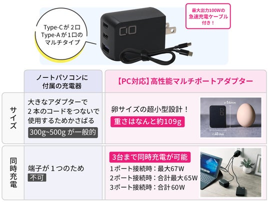 ・ポート/出力:3ポート搭載(USB Type-C2口、USB Type-A1口)/最大67W