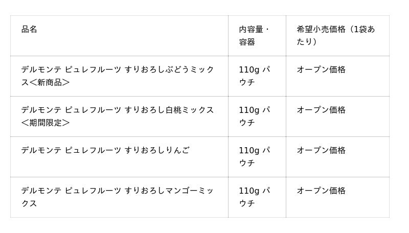 いつでもどこでも楽しめる!持ち運べるすりおろし果実!「デルモンテ ピュレフルーツ すりおろしぶどうミックス」新発売!
